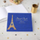 Livre d'or sur le thème parisien Sweet 16 fêtes réalisé en bleu royal sur motif bleu, avec des graphismes d'une parties scintillant dorée en forme de tour Eiffel. Personnalisez les champs de texte pour votre journée spéciale.