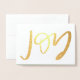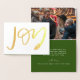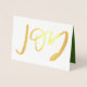 Festive feuille d'or "JOY" met en évidence cette carte de voeux pliée avec photo en option à l'intérieur.