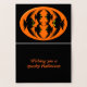 Cette superbe carte en papier fin est orangée et présente six corbeaux. Chaque corbeau a des yeux jaunes avec des élèves noirs et des ailes étirées. Les corbeaux volent vers l'autre formant une forme ovale. L'arrière - plan est noir.