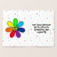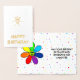 L'intérieur est orné d'une fleur souriante avec des pétales à pointes arc-en-ciel sur un arrière - plan à pois coloré. L'extérieur a le message "Joyeux Anniversaire" et la fleur en feuille.