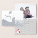 Elégante carte de voeux de vacances faite en feuille d'argent avec des graphiques d'une perdrix stylisée et la lecture de texte Joy, sur le devant. L'intérieur de la carte a le dessus fait comme une zone photo personnalisée et le fond est fait dans un motif pois gris clair et blanc, avec un peu de perdrix rouge et blanc, dans le coin inférieur. Personnalisez le texte à l'intérieur de la carte et de l'image pour répondre à vos besoins de carte de Noël. Photo du modèle de Lorri Lang.