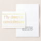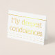 Cette carte de voeux simple et basique, en feuille d'or, présente le message "Mes condoléances les plus profondes" sur le devant, ainsi qu'un message customisé à l'intérieur. Une carte comme celle-ci pourrait peut-être être utilisée pour offrir de la sympathie à quelqu'un qui a subi une malchance.