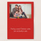 Cette carte présente un vœux de Joyeux Noël en feuille d'or sur le devant. À l'intérieur se trouve le message « Envoyant des vœux de Noël de notre famille à la vôtre » sur fond rouge. Vous pouvez insérer une photo de votre propre famille pour personnaliser cette carte.