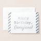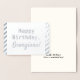 Cette simple carte de voeux d'anniversaire en feuille d'argent comporte le message "Joyeux anniversaire" sur le devant, et un nom qui peut être personnalisé. Il y a un message personnalisé à l'intérieur. On pourrait le donner à quelqu'un qui fêterait un anniversaire.