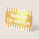 Cette carte de remerciement en feuille d'or qui attire l'attention et qui affiche un message de MERCI pour VOTRE AIDE! sur le devant, ainsi qu'un message personnalisable à l'intérieur. Il pourrait être utilisé pour témoigner de l'appréciation à quelqu'un qui a assisté à un mariage, à des funérailles, à un diplôme ou à un autre événement.