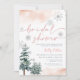 Invitation à la douche nuptiale d'hiver. Rose et rougir avec pins et flocons de neige.
