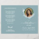Programme de service commémoratif moderne imprimé sur une feuille de papier que vous pliez vous-même. Le programme funéraire présente la photo de votre être aimé à l'intérieur d'une couronne blanche dessinée à la main sur un arrière - plan bleu colombe.