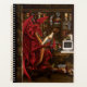 Dragon rouge assis dans sa tanière d'ordinateur lisant un livre. Derrière, il y a du matériel de baladodiffusion et un ordinateur sur son bureau.