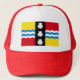 Casquette avec design avec un drapeau du comté historique de Bedfordshire, en Angleterre, Grande-Bretagne; drapeau rouge et or avec bande verticale noire avec trois pétoncles blancs au centre