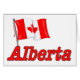De grandes lettres rouges épellent le nom de la province, l'Alberta, avec un drapeau canadien ondulé derrière. Ce design est disponible sur un large assortiment de t-shirts, cadeaux et autres vêtements.