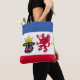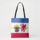 Sac fourre-tout avec variante du drapeau de Mecklembourg-Poméranie occidentale; conception avec cinq bandes horizontales de rouge, blanc, bleu et jaune, avec illustrations de la tête de taureau et de l’aigle rouge