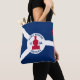 Sac fourre-tout avec drapeau de la ville de Fort Wayne, Indiana; drapeau bleu et blanc et blockhouse rouge au centre et trois illustrations dans le champ bleu - illustration de la tête des Amérindiens, fleur de lys français et lion britannique