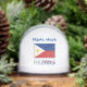 Boule de neige personnalisée avec le drapeau philippin et le mot PHILIPPINES ci-dessous dans les couleurs du drapeau. Ci-dessus, en lettres bleues, est un endroit pour un nom. Créez quelque chose pour vous-même ou un cadeau. Fait un joli cadeau de vacances ou rembourrage.