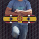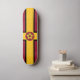 Skateboard avec design avec un drapeau du comté historique de Northamptonshire, en Angleterre, Grande-Bretagne; drapeau marron avec une croix d'or et le rose traditionnel du comté dans le centre