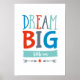Dream Big Petite affiche de garçon Dream avec typographie manuscrite moderne. Idéal pour une chambre d'enfant et convient à un décor rouge, bleu, aqua et gris.