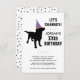 L'invitation parfaite à la fête d'anniversaire pour les amoureux de les chiens avec un chien de laboratoire noir portant un casquette de fête festive - juste ajouter vos détails pour personnaliser. Modifiez facilement la couleur de l'arrière - plan en cliquant sur customiser et en faisant défiler vers le bas vers le sélecteur de couleurs. Fonctionne bien pour les fêtes d'anniversaire des enfants et des adultes.