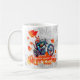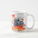 Tasse à café amusante avec arrière - plan gris montrant la mascotte Marlee (EcoMarlee) chevauchant sa moto avec les mots "Je chéris chaque feuille que je écrase" Il y a aussi une tasse similaire avec un arrière - plan coloré.