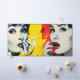 Two women are depicted in a vibrant, pop art style, one in shades of blue and yellow and the other in grayscale with bold red lipstick. The background features a mix of abstract patterns in red and yellow tones.