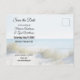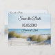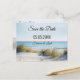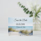 Une belle carte postale Save the Date avec une image de dunes donnant sur une plage et l'océan. Parfait pour un mariage planifié à la plage.