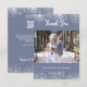 Célébrez votre journée spéciale et express votre gratitude sincère avec nos Cartes de Mariage Photo Personnalisées, élégamment conçu avec un arrière - plan bleu foncé sophistiqué et tendance décoré de parties scintillant faux argent. Parfaites pour partager vos souvenirs mariages préférés, ces cartes sont à la fois élégantes et personnelles, offrant une façon unique de remercier vos invités. Personnalisez et ajoutez votre photo et merci note. Texte blanc. Retour : ajoutez votre URL/lien à votre site mariage pour plus de photos.
