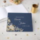 Ce livre d'hôtes Dusty Blue Autumn Boho mariage associe une ambiance antique à un style rétro bohème fleur sauvage. Les élégants fleurs sauvages beiges neutres, en plus de l'arrière - plan bleu poussiéreux, marine, avec sa typographie calligraphique classe, permettent un thème formel mais sauvage et fleuri, style vintage de célébration du mariage.