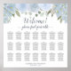 Cet élégant tableau de bord est conçu pour accueillir 210 personnes à 21 tables, chacune équipée de 10 places. Le tableau présente une esthétique bohème-chic, avec des roses d'aquarelle peints à la main, des fleurs et des fleurs dans des teintes bleues douces et poussiéreuses, ainsi que des feuilles d'eucalyptus verts sauge et une variété de feuillage de jardin. Le titre du graphique, écrit en calligraphie cursive délicate, dit : "Bienvenue ! S'il vous plaît, trouvez votre table." Le graphique comprend également des espaces pour les noms du couple et la date du mariage. C'est une belle façon d'accueillir les clients et de faciliter la recherche de sièges à la réception.