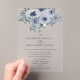 A beautiful dusty blue watercolor floral on our acrylic clear wedding invitation with grey text from bride and groom with parents.