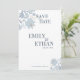 Elegant dusty blue floral save the date design featuring soft romantic wildflower elements in a timeless wedding style. Perfect for modern, rustic, garden, and farmhouse weddings. Designed to create a refined and luxurious first impression, this minimal yet artistic layout highlights the couple’s names with clean typography and soft botanical accents. Ideal for couples looking for a romantic, classy, and cohesive wedding stationery suite.