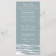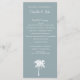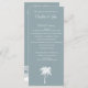 Dusty Blue Tropical Palm Tree Destination thé long programmes de mariage avec Ocean Waves sur le dos. Élégant programme de mariage sur la plage