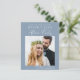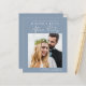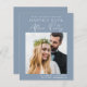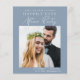 Un bleu poussiéreux et économique sauvez la date d'une réception ou d'une fête après votre évènement ou mariage privé qui comprend votre photo, "Save The Date For Our Happily Ever After Party" dans une simple typographie blanche et un script blanc moderne chic et vos noms et date de réception. Au verso, customisez votre message de date et ajoutez vos noms mariés dans un script signature.