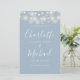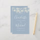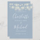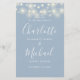 Programme de mariage de signature bleu Dusty avec de jolies lampes à cordes et une typographie moderne chic. Ce programme de mariage élégant peut être personnalisé avec vos informations spéciales de jour de mariage. Conçu par Thisisnotme©