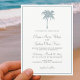Dusty Blue Tropical Palm Tree Destination Mariage Invitations Avec Vagues Océaniques Sur Le Dos. Elégant Beach Wedding Invitation Cartes