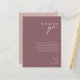 Cette carte de remerciements de réception Dusty Boho Purple et Rose est parfaite pour votre mariage boho rustique et coloré. Son design moderne simple et unique, accompagné d'une écriture contemporaine minimaliste, d'un rose poussiéreux et d'une palette de couleurs mauve violet, donne à ce produit une atmosphère bohème chic classique. Gardez-le tel quel, ou choisissez de le personnaliser avec des illustrations ou des graphiques de votre choix. Vous pouvez également chercher d'autres produits dans cette collection pour réunir votre mariage entier !