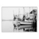 Bateaux de crevettes à quai sur un matin brumeux, noir & blanc, réflexion d'eau