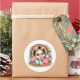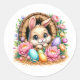 Round sticker is shown with a cute Easter bunny and flowers art print.