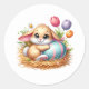 Round sticker is shown with a cute Easter bunny art print.
