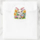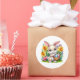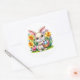 Round sticker is shown with a cute Easter bunny and flowers art print.