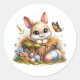 Round sticker is shown with a cute Easter bunny art print.