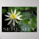 Un lys d'eau blanche serein, ouvert à la floraison complète, repose la tranquillité dans un étang paisible de saletés verdoyantes. En dessous de la fleur se trouve le mot "Serenity", épelé dans une police de caractères serif crème pâle. L'image calme et relaxante ferait un ajout parfait à n'importe quelle maison, studio de yoga, ou espace méditatif. Photographie © Cheryl M. Barber.