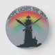 "Hope Lights the Way" comporte un phare et un arc-en-ciel. Le phare est un symbole d'espoir, et l'arc-en-ciel est un rappel que même dans les temps les plus sombres, il y a toujours de la lumière. Le texte "Hope Lights the Way" est écrit dans une police bouclante cursive autour de la face de l'horloge. Les mains sont noires et la face de l'horloge elle-même est blanche.L'horloge murale que vous m'avez envoyée a un design phare au centre, avec les mots "Hope Lights The Way" écrit en cercle autour. Les aiguilles de l'horloge sont noires et l'heure est réglée à 3:15. Le phare est blanc avec un toit rouge et des fenêtres noires. Il y a un arc-en-ciel qui sort de la base du phare.Hope Lights the Way" écrit dans un cercle autour du bord. Au centre de la face de l'horloge se trouve une illustration d'un phare avec un arc-en-ciel qui en sort. Le phare est un symbole d'espoir et d'orientation, et l'arc-en-ciel est un symbole de promesses et de nouveaux débuts. Les aiguilles de l'horloge sont noires et semblent être faites de métal.