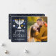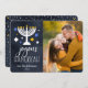 Festive Hanoukka carte photo présente votre photo préférée alignée à droite, avec "Hanoukka joyeuse" en lettres blanches sur un riche arrière - plan bleu marine orné d'étoiles et d'une menorah éclairée. Personnalisez avec vos noms et l'année.
