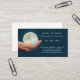 Carte de visite professionnel avec une main offrant un globe illuminé sur un arrière - plan bleu foncé.