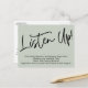 Si vous préférez simple et décontracté, ceci pourrait être la carte de faire-part pour vous. L'avant comporte un en-tête graphique que j'ai conçu en utilisant une police d'écriture moderne et décontractée, qui dit "Écoute !". En bas, il y a un message avec un ton de conversation que vous pouvez modifier, qui déclare les nouvelles sur la nécessité de changer votre date de mariage. Utilisez les champs modèles pour ajouter vos données personnelles et modifier n'importe quel de mes projets de texte pour répondre à vos besoins et à votre situation. L'arrière - plan peut être changé en n'importe quelle couleur.