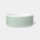 A colorful pet bowl with a geometric pattern of overlapping diamonds in cyan, magenta, and yellow on a white background. The design is vibrant and eye-catching.