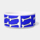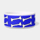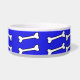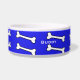 Bol d'eau/nourriture pour chien en céramique blanche, bleu, autour de l'extérieur. Des images d'os de dessins animés, courent autour de l'extérieur du bol. Le texte blanc personnalisé, à l'avant, est prêt à personnaliser, pour votre animal de compagnie ou comme une idée de cadeau pour tout propriétaire d'animal de compagnie. Des produits assortis pour animaux de compagnie sont disponibles.
