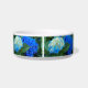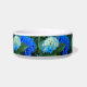 Bowl de nourriture pour animaux de compagnie en céramique pour votre chat ou chien qui présente une photo de fleurs d'Hydrangea bleu et imprimé dans un motif extensible. Un joli design floral ! Sélectionnez la taille de votre bol d'animal de compagnie.