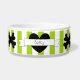 Bol à nourriture pour animaux de compagnie en céramique, avec un fond rayé vert et blanc adorable, un cœur noir avec une bannière pour le nom de votre chien, et des os de chien croisés noirs. Choisissez simplement l'option personnaliser pour ajouter le nom de votre chien ! Trop mignon !