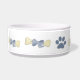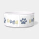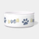 Choyez la cuvette pour le chien avec des os, des arcs de bleu et des empreintes de pattes bleus.