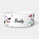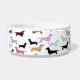 Cuvette mignonne pour que votre animal familier mange ou à boit hors de. Il comporte un bon nombre de petit teckel le poursuit partout dans beaucoup de couleurs. Il y a un espace pour customiser votre nom d'animal familier.