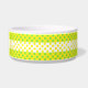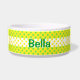 Plat coloré d'animal familier fait dans en céramique blanc, avec un vert sur la bande jaune de motif de point de polka autour de la cuvette, avec un jaune sur la bande blanche de point de polka au milieu. Le texte vert, sur l'avant, est prêt à personnaliser pour votre animal familier.